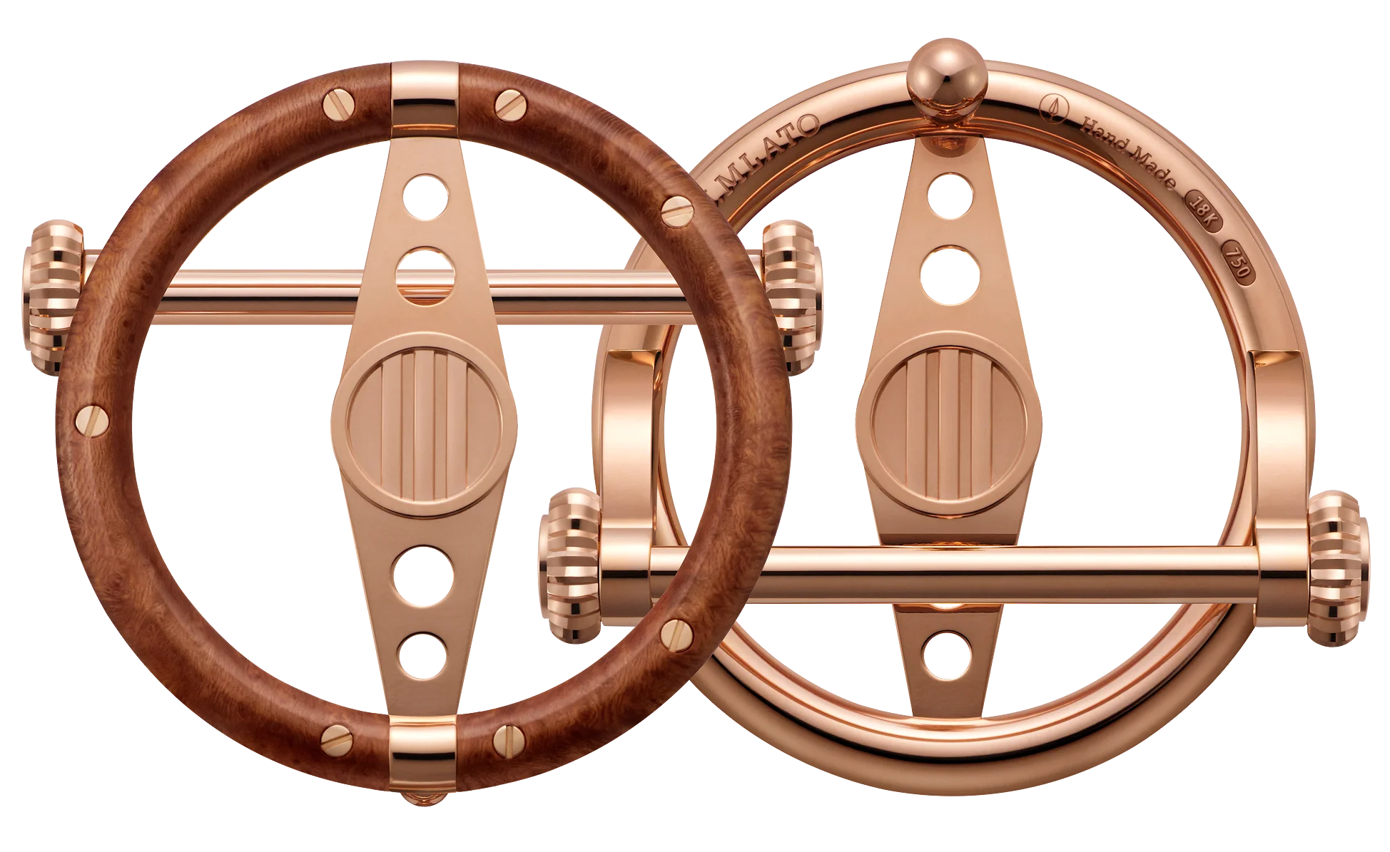 以金属/皮革和珍贵木材制造一枚精美的腰带扣,灵感来自古董车的方向盘: